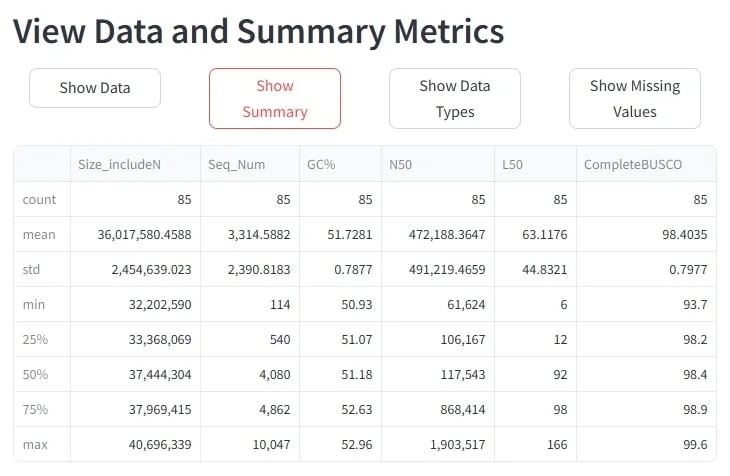 The app comes pre-loaded with an example dataset (assemblies.csv), but you can upload your own file to get started with your data. Just drag and drop or click Browse files to upload your data, and the app will automatically process it.
