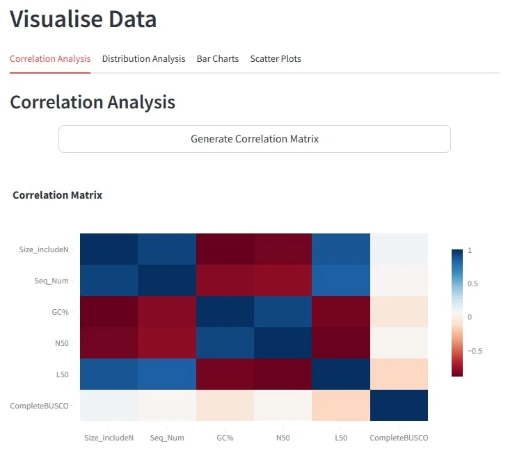 Click Generate Correlation Matrix to visualise pairwise Pearson correlation coefficients between numeric columns. The heatmap uses a red-blue colour scale, with tooltips showing exact correlation values when you hover over each cell.