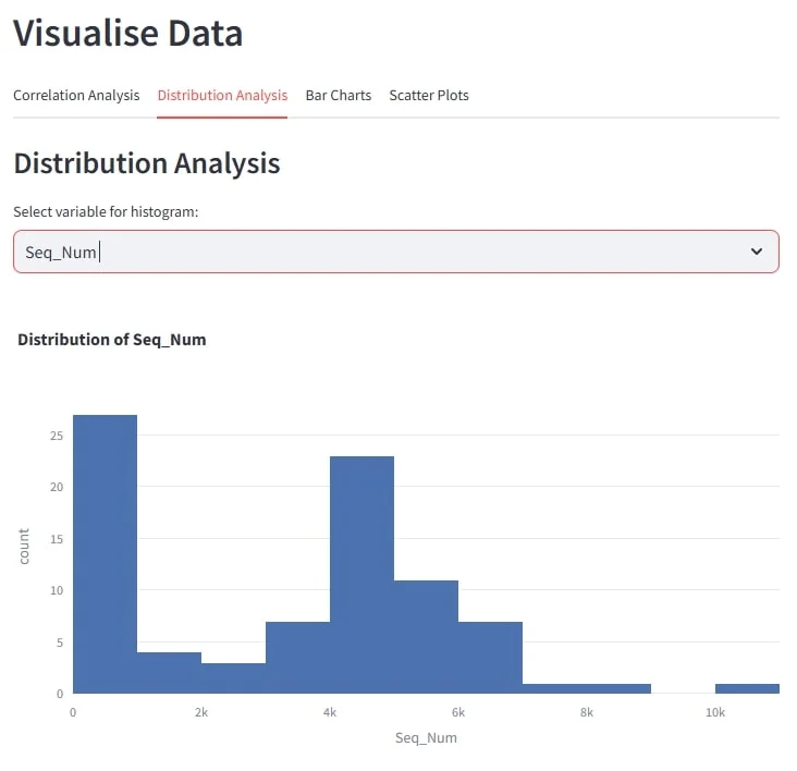 Select a column from the dropdown menu to generate a histogram of its values. This is a quick and easy way to spot outliers or skewed distributions.